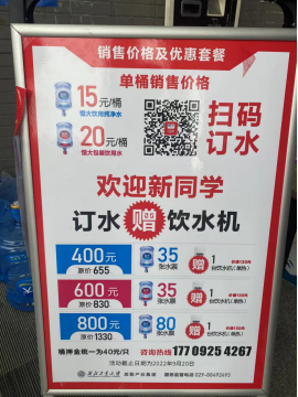 为在宿舍能够饮用方便且卫生的纯净水,开学后会有饮水供应公司人员提供订购服务,各宿舍可凭需求意愿订购(一般开学那几天订购是有优惠的哦~)以下附上学长学姐珍藏的订水信息,各位萌新们按需获取