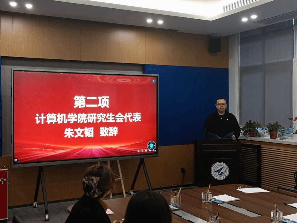 在雄壮的国歌声中,大会拉开帷幕。大会第二项由学院研究生会执行主席朱文韬代表研究生会致辞。朱文韬回顾了2023年秋季学期开学以来研究生会取得的阶段性成果,表示在未来工作中将继续带领研究生会践行“全心全意为同学服务”的宗旨。