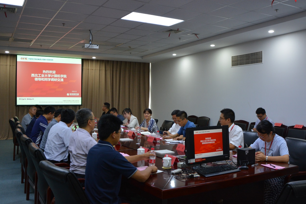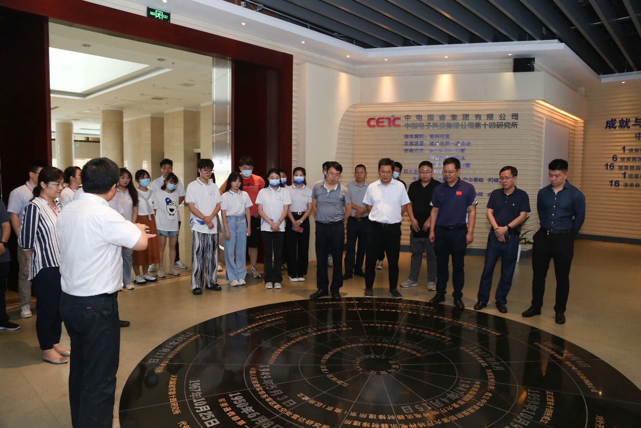 一行来到了中电十四所。十四所二部党总支书记夏贤江、三部党总支书记倪菁、人力资源部经理刘佳和相关部门领导、技术专家参加了本次活动。首先,夏贤江代表十四所对学院一行表示热烈欢迎,并带领学院师生共同参观了中国雷达工业发源地展馆。随后,双方围绕院所合作、人才输送、党建交流等方面举行了座谈会。