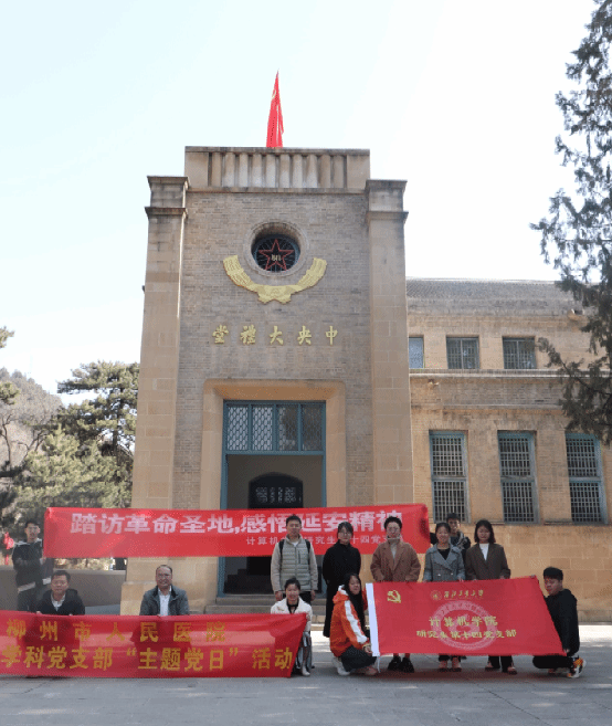 在中央大礼堂门前,研究生第十四党支部同远道而来的柳州市人民医院下属党支部共同开展了主题党日活动,双方共同交流了基层党支部建设经验,以“我身边的优秀共产党员”为主题分享榜样故事,回首入党初心,感悟延安精神。