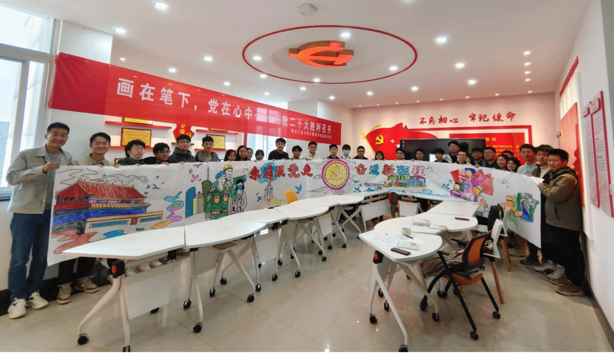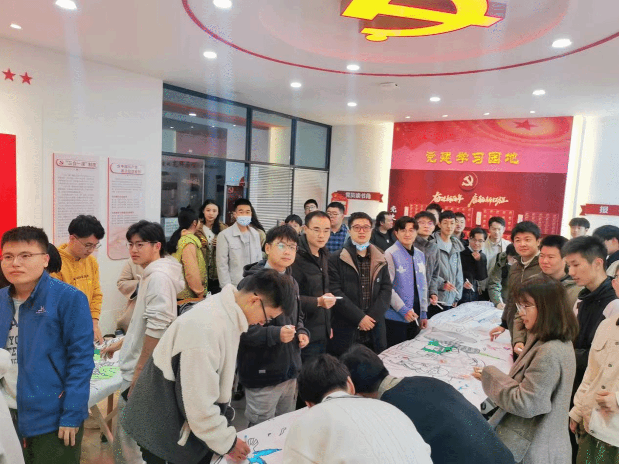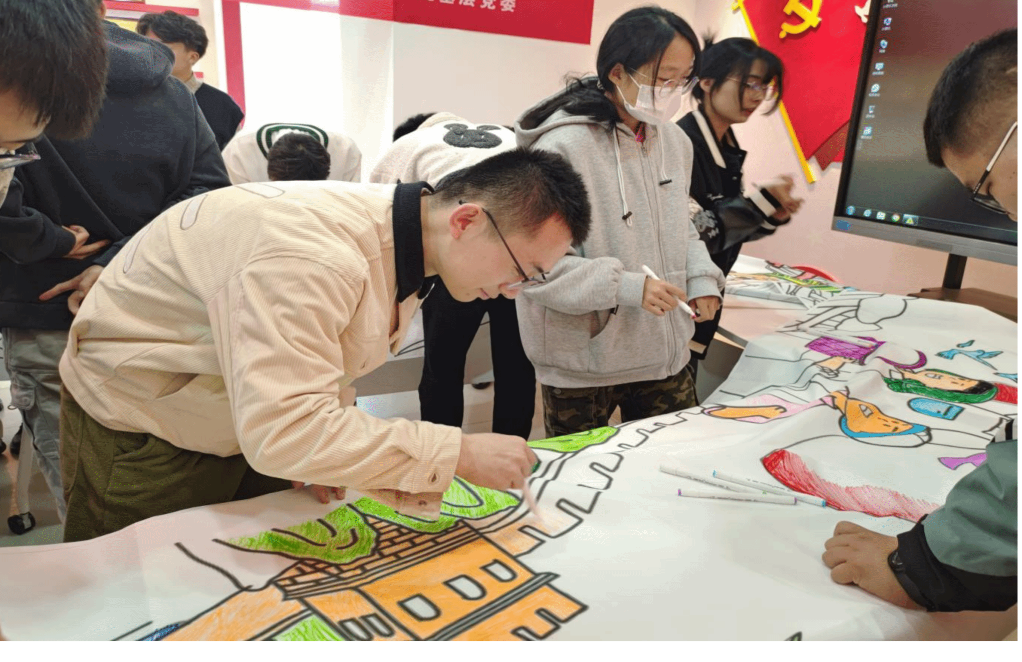 党委在学院楼党建活动室开展了“画在笔下,党在心中”——“百米画卷”庆祝党的二十大胜利召开活动。活动覆盖各年级、各支部同学,学院组织员曹香老师与同学们一起同绘画卷,现场氛围积极向上、浓烈而喜庆。