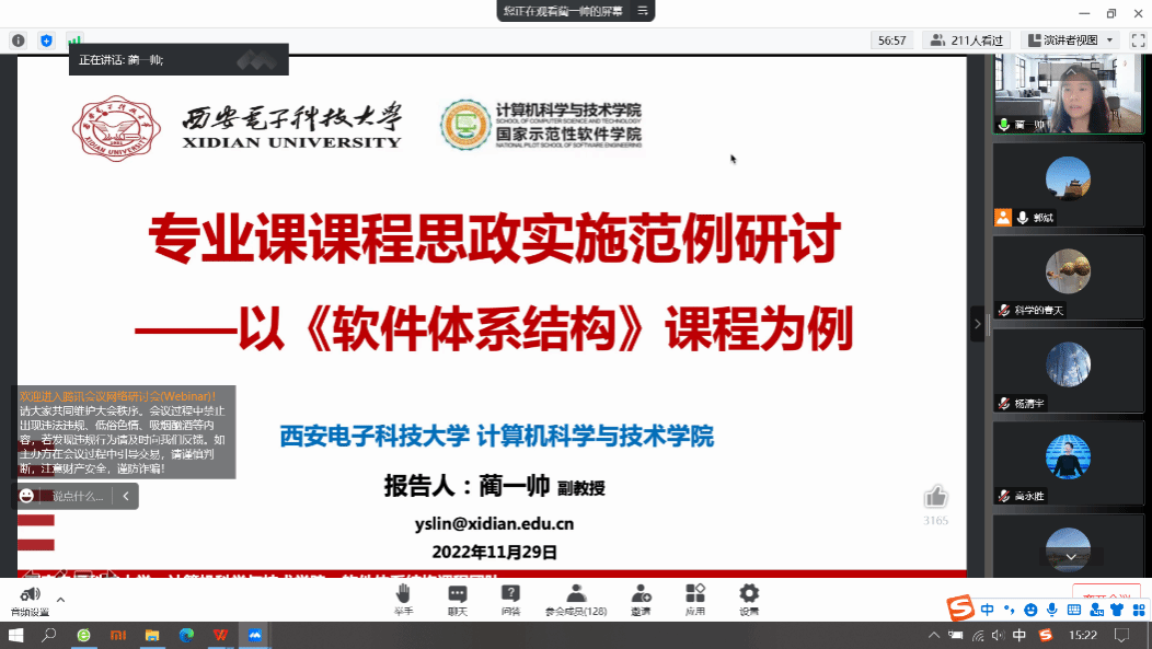 王党辉副教授、西安电子科技大学蔺一帅副教授、西安交通大学杨清宇教授先后做交流报告,分别从人才培养目标、课程思政建设目标,课程思政教学设计,思政素材库建设等方面,讲解了各自在课程思政教学中的经验和成果。