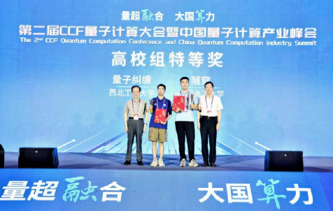 张伟伟副教授指导的本科生参赛队伍“量子纠缠”队获特等奖,现场由中国量子光学和量子信息开创者、奠基人郭光灿院士颁奖。