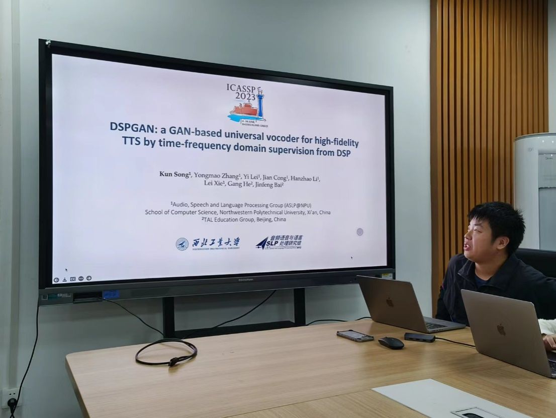宋堃分享了cassp参会感受并介绍了团队的鲁棒神经声码器论文。在报告中,宋堃介绍了团队的研究成果——DSPGAN,一个基于生成对抗网络的数字信号处理的声码器。这种技术在语音合成领域中显示出很大的潜力,尤其是在时域和频域的监督方法上。他在报告中详细描述了如何使用基于GAN的DSP来提高声码器的语音合成质量,使其更加高保真。特别地,他强调了一点,即当前许多基于GAN的声码器在合成语音时,常常会产生噪音、不连续以及声音不够饱满的问题,而他的DSPGAN在解决这些问题时体现较好的优越性。