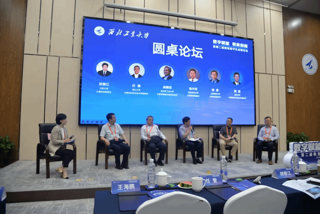 院长胡振江、浙江大学计算机科学与技术学院院长任奎、哈尔滨工业大学计算学部教学委员会主任战德臣、上海交通大学计算机系副主任骆源、西安交通大学计算机科学与技术学院副院长唐亚哲在尚学群的主持下进行圆桌论坛,就如何落实国家教育数字化战略、加快教育创新与人工智能、大模型、元宇宙等技术的深度融合进行深入研讨,汇聚力量、形成共识,共同探索教育数字化未来发展方向。