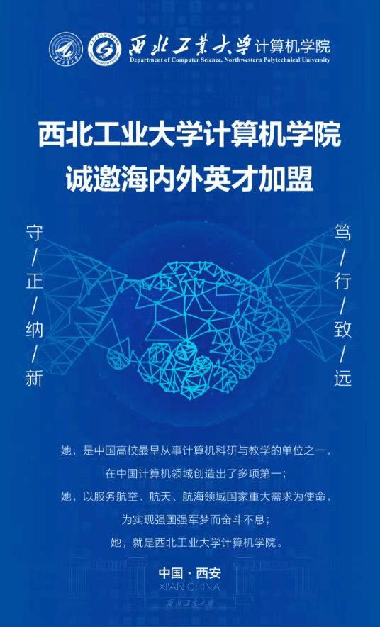 (简称西工大)坐落于陕西西安,是一所以发展航空、航天、航海等领域人才培养和科学研究为特色的国家“双一流”建设高校,隶属于工业和信息化部。学校1960年被国务院确定为全国重点大学,“七五”“八五”均被国务院列为国家重点建设高校之一,1995年首批进入“211工程”,2001年进入“985工程”,2017年进入“一流大学”建设高校(A类)行列,是“卓越大学联盟”成员高校,是“一带一路”航天创新联盟发起高校。今天在加快建设中国特色世界一流大学和一流学科上续写新的辉煌。
